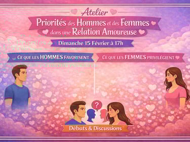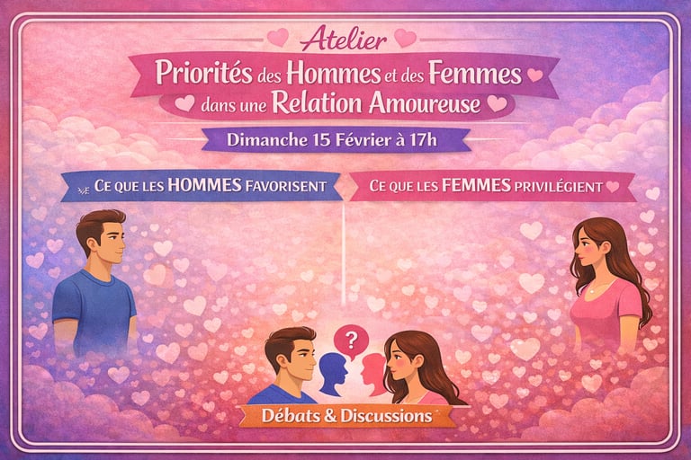 Lors de cet atelier, nous allons explorer les priorités relationnelles des hommes et des femmes, non pour opposer, mais pour mieux comprendre ce qui se joue réellement dans la relation.